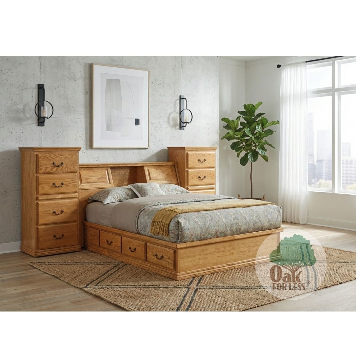 OD-O-T456 Wooden platform bed with OD-O-T475 Bookcase headboard and two side piers with drawers in a bedroom setting - Oak For Less® Furniture